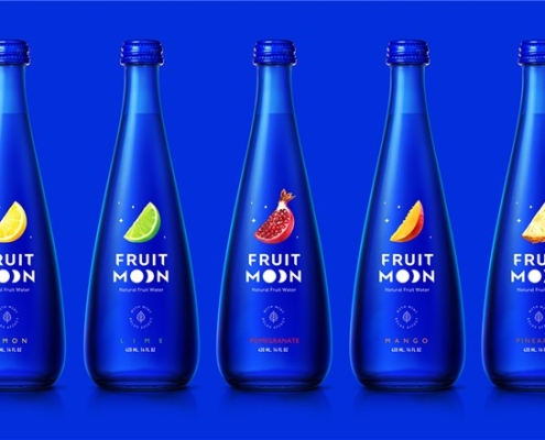 蓝色的瓶子像是夜空,月亮由水果制成,不同口味的饮料选用相对应的水果,整体的设计给人以梦幻的感觉。